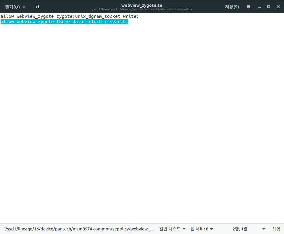 마지막 줄인 allow webview_zygote theme_data_file:dir search;를 지워줍니다.